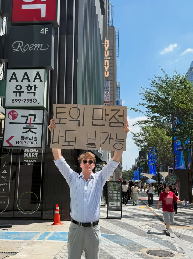 강남 거리에서 피켓 하나로 사람들의 시선을 사로잡는 핫한 인물이 있다는데요 👋 바로 미국인 아담 노박입니다. “토익만점 나도 불가능” “ 왜 나만 솔로야 “ “칼퇴 마렵다” 등등 공감가는 피켓을 상자 위에 적어서 강남에서 피켓을 들고 다니는 아담 노박을 보며 사람들은 “지나가는 토익연구원입니다. 토익수험생들에게 위안을 주고자 스토리 공유했다” “ 통역사인데 만점 안 나옵니다” 등등 재밌는 반응을 보여줬습니다 .