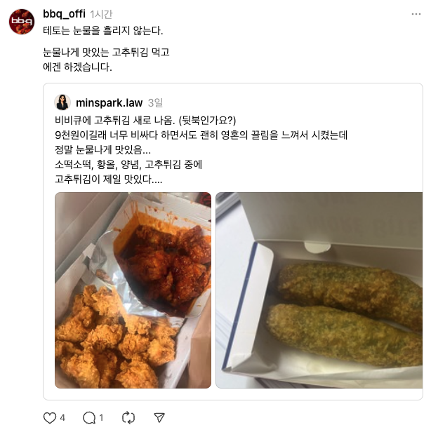 비비큐는 팔로워의 게시글을 리포스트 하며 일상적인 글에서도 치킨과 연결 시키며 소비자와 소통해요 🐔특히 일반 스레드 이용자가 부모님의 생일케이크를 고민하는 글에 ‘비비큐로 했으면 상견례 프리패스’ 라는 재치있는 코멘트를 남기기도 했죠 🤣 소비자와 친근한 대화를 나누는 것이 비비큐의 스레드 활용법이랍니다🍗 |