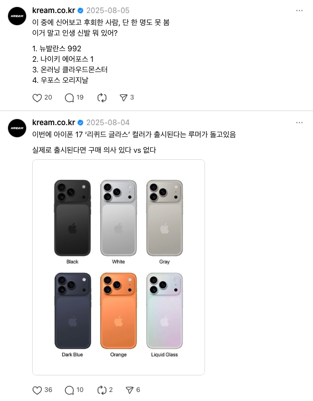 크림은 사람들의 댓글 참여를 유도하는 질문형 게시물을 중심으로 소비자와 소통하고 있는데요💬 “요즘 신고다니는 신발”, “ 회사에 크록스 신어도 된다 vs 안된다” 등 대화가 오갈 수 있는 질문을 제시하며 참여율을 높이고 있어요 👍 |
